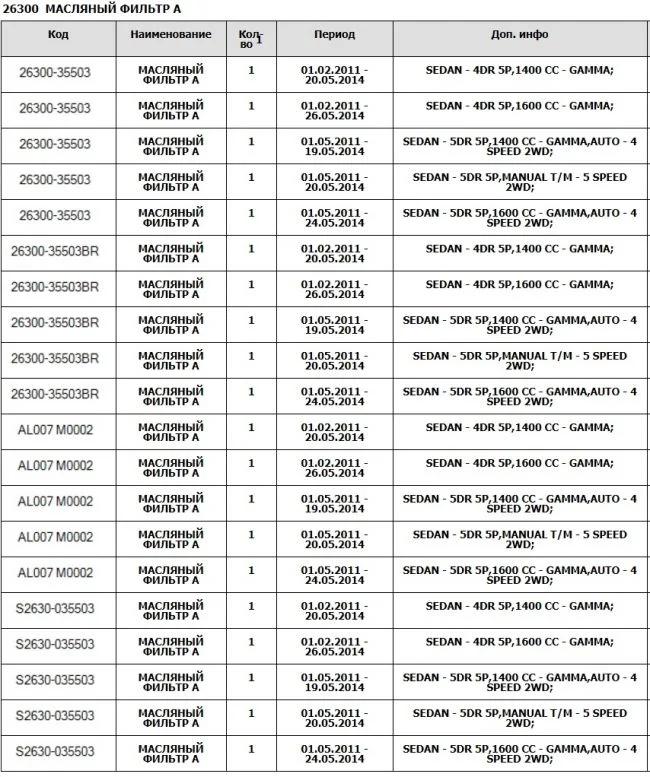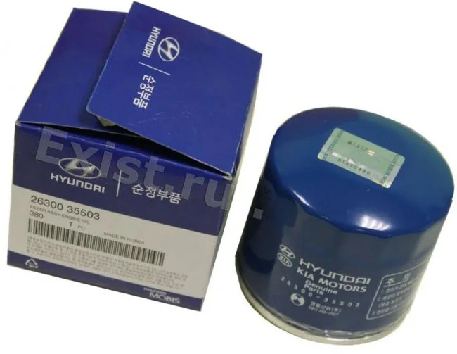 Оригинальный фильтр двух клапанный имеет основной артикул Hyundai/Kia 26300-35503, а также дополнительные оригинальные артикулы Hyundai/Kia 26300-35504, Hyundai/Kia 26300-35502.