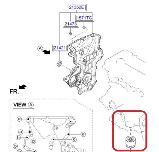 Масляный фильтр двигателя на Солярисе установлен со стороны радиатора, ближе к коробке, снизу. Собственно снизу его и меняют. На схеме мотора обведено красным.
