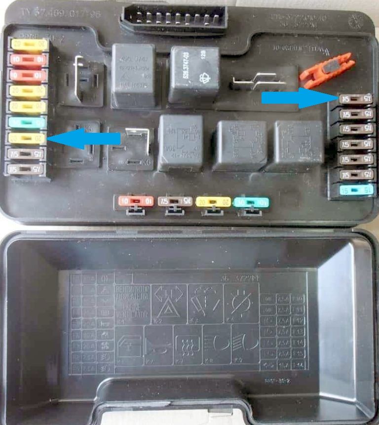 В первом варианте, согласно схеме за электрическую цепь прикуривателя отвечает предохранитель F7 (30А) и за лампочку подсветки F10 (7.5А). Ниже на фото отмечены нужные предохранители.
