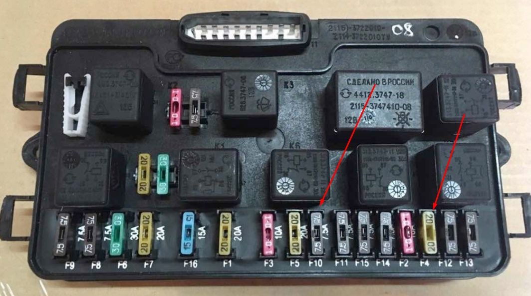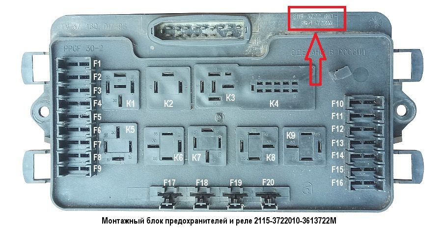 На небольшое количество моделей ВАЗ 2113, 2114 и 2115 устанавливался блок предохранителей нового образца “2115-3722010”. Его основные отличия от экземпляров 2114 - это более высокая влагозащищенность, измененные платы внутри блока, а также чуть измененное расположение предохранителей и реле. Маркировка, как и в других блоках указана в верхней правой части корпуса блока (ниже на фото стрелкой отмечено расположение маркировки).
