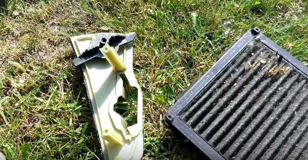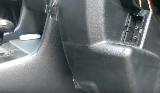 Затем снять обшивку, пластмассовую нижнюю накладку торпедо в районе колен пассажира, чтобы удалось добраться до фильтра. Накладка держится на нескольких саморезах. Их придется снять фигурной отверткой. После этого отстегнуть провода подсветки бардачка.Дальше нужно снимать воздуховод уже полностью, отвернув вот этот саморез.