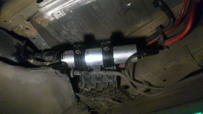 Топливный фильтр расположен под машиной с левой стороны. Чтобы к нему добраться, понадобится снять защиту. После этого фильтр легко обнаружить и заменить.