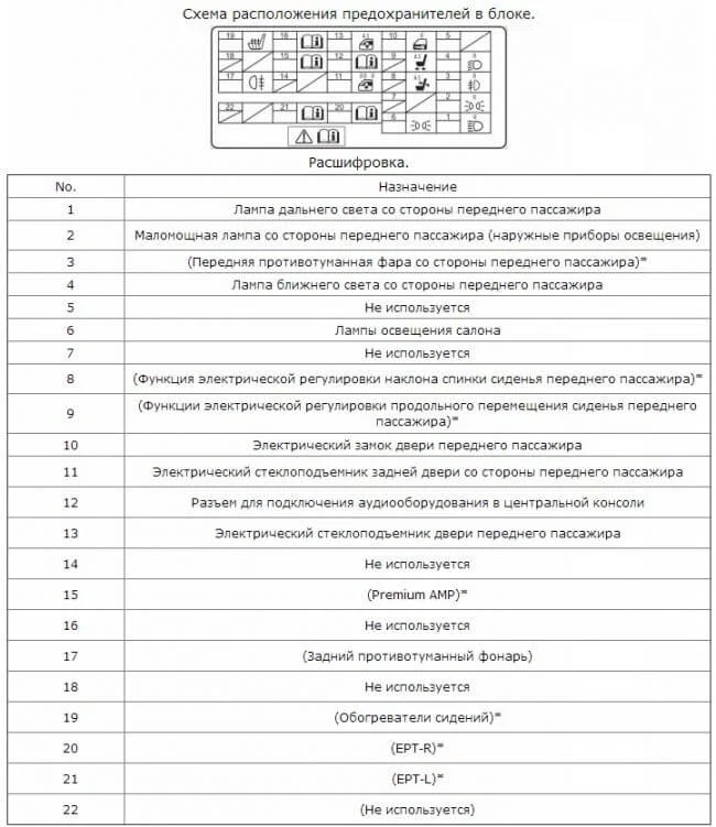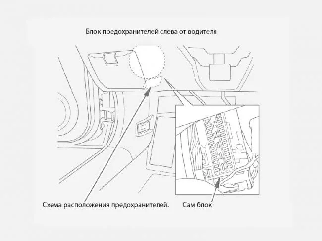 Один из салонных блоков стоит слева от водителя. На шильдике можно сверить схему установки предохранителей.