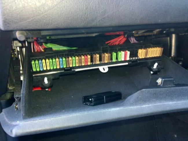 Электросоставляюще автомобиля БМВ Е39 защищены блоком предохранителей. Он находится в верхней части перчаточного бардачка.