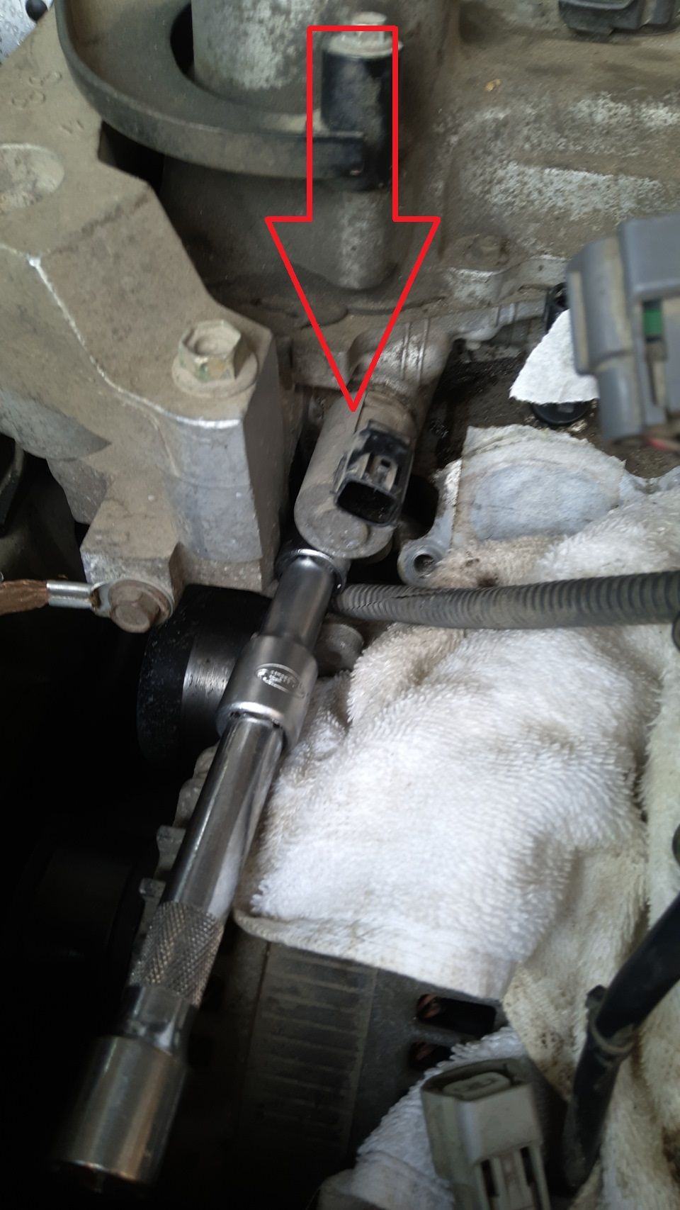 С левой стороны ГБЦ, если стоять лицом к машине, в ближнем к нам углу есть клапан vvt-i, а под ним, над генератором в виде заглушки пробка, под шестигранник.