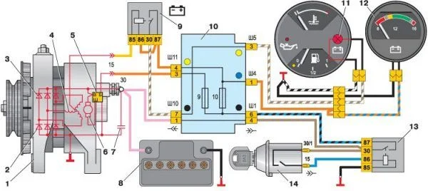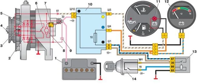 Схема генератора Г-222: 1 — генератор; 2 — отрицательный диод; 3 — положительный диод; 4 — обмотка статора; 5 — регулятор напряжения; 6 — обмотка ротора; 7 — конденсатор для подавления радиопомех; 8 — аккумуляторная батарея; 9 — реле контрольной лампы заряда аккумуляторной батареи; 10 — монтажный блок; 11 — контрольная лампа заряда аккумуляторной батареи в комбинации приборов; 12 — вольтметр; 13 — реле зажигания; 14 — выключатель зажигания.
