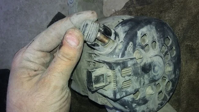 Далее залезаем под машину и отключаем колодку с проводами от генератора и вынув резиновый пыльник-защиту откручиваем головкой на 13 силовой провод.