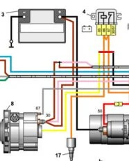 Реле лампы зарядки и генератор. От реле отключаем желтый и черный провода и соединяем между собой(красная линия). Второй конец жёлтого провода подсоединяем к генератору. Серый провод остаётся висеть в воздухе. Его можно заизолировать и отключить от реле регулятора(клемма 67)