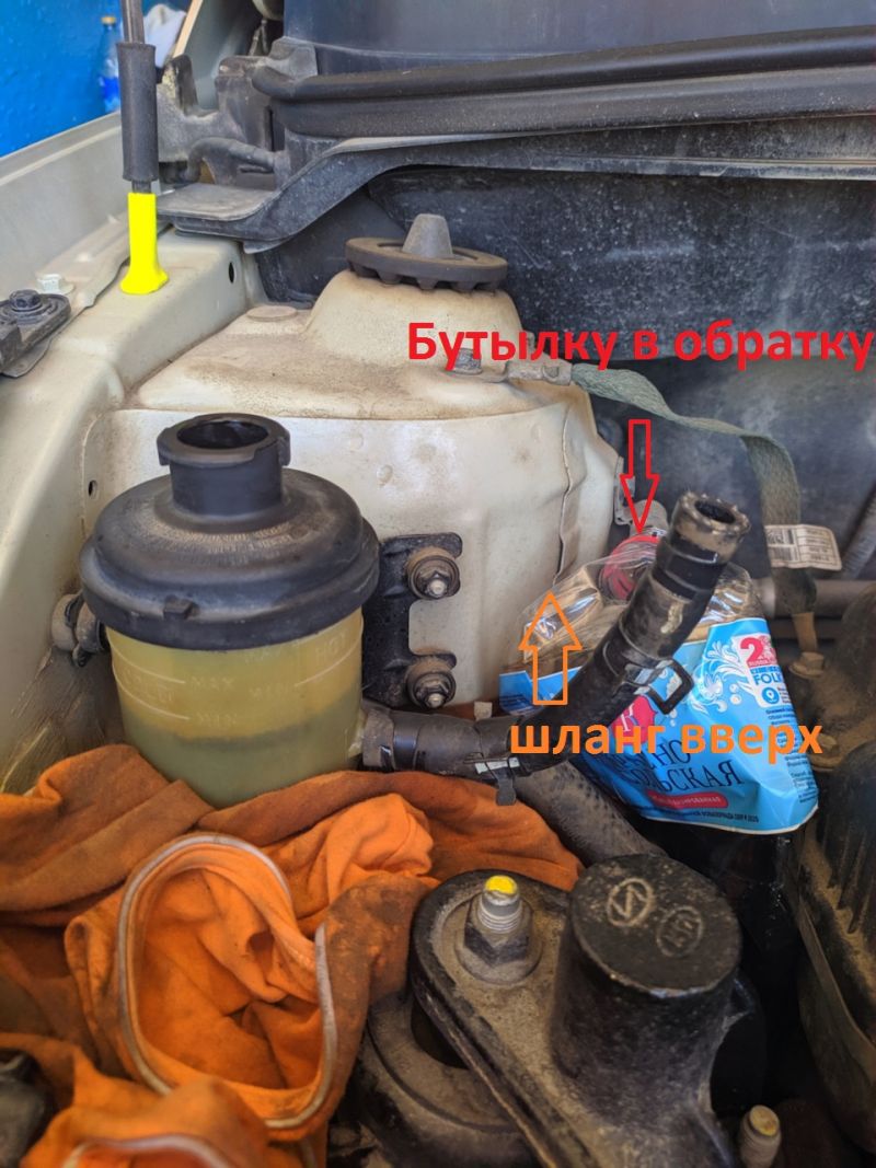 В обратной последовательности соберите все обратно, только шланг обратки соединяем с бачком, а со штуцера обратки убираем, сам шланг вторым концом оборачиваем вверх, что бы жидкость не ушла из бачка. Залейте полный уровень, запустите мотор, вращайте рулем до упора влево и вправо, выставите колеса ровно и снова долейте жидкость, а под штуцер обратки подставьте емкость. Произведите операцию несколько раз, пока обратно не польется чистая зеленая жидкость.