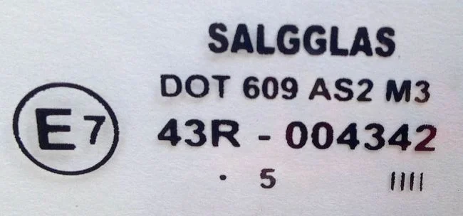 1 SALGGLAS — товарный знак производителя автостекла. Соответственно, изготовитель неоригинального элемента будет уже другим.2 DOT 609 AS2 M3 — соответствие американским стандартам безопасности DOT, AS, M.3 43R-004342 — соответствие европейскому стандарту безопасности ECE R43.4 Символ «E7» в круге — код страны, в которой стекло было сертифицировано (но не изготовлено). Коды стран: 1 — Германия, 2 — Франция, 3 — Италия, 4 — Нидерланды, 5 — Швеция, 6 — Бельгия, 7 — Венгрия, 8 — Чехия, 9 — Испания, 10 — Югославия, 11 —Англия, 12 — Австрия, 13 — Люксембург, 14 — Швейцария, 16 — Норвегия, 17 — Финляндия, 18 — Дания, 19 — Румыния, 20 — Польша, 21 — Португалия, 22 — Россия, 23 — Греция, 24 — Ирландия, 25 — Хорватия, 26 — Словения, 27 — Словакия, 28 — Беларусь, 29 — Эстония, 31 — Босния и Герцеговина, 32 — Латвия, 37 — Турция, 42 — Европейское сообщество, 43 — Япония.