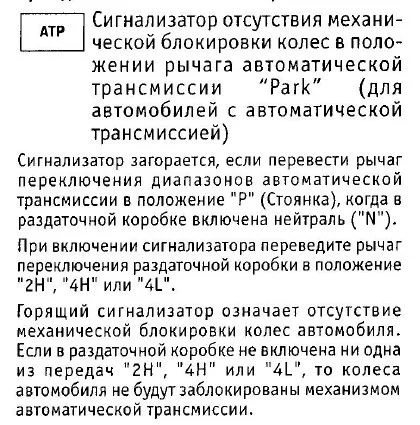 Предупреждающий сигнализатор ATP загорается при переключении переключателя системы 4WD из положения ”4H” в положение ”4LO” или из ”4LO” в ”4H”, когда рычаг селектора АКП находится в положении ”N” или ”P”.