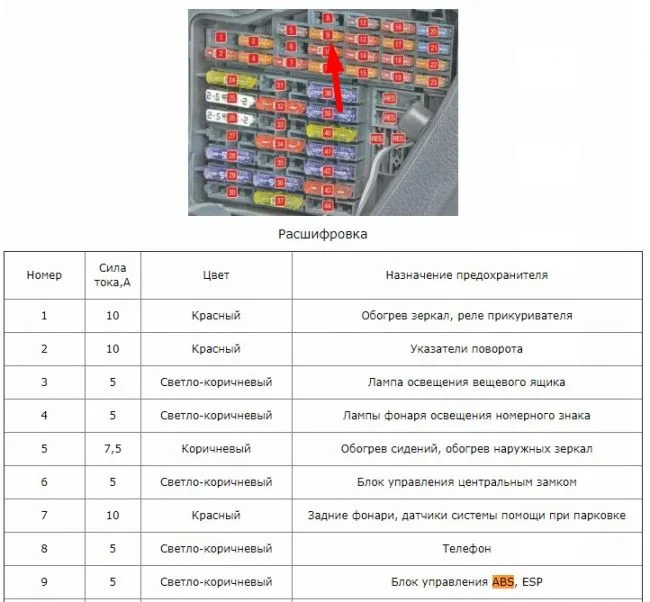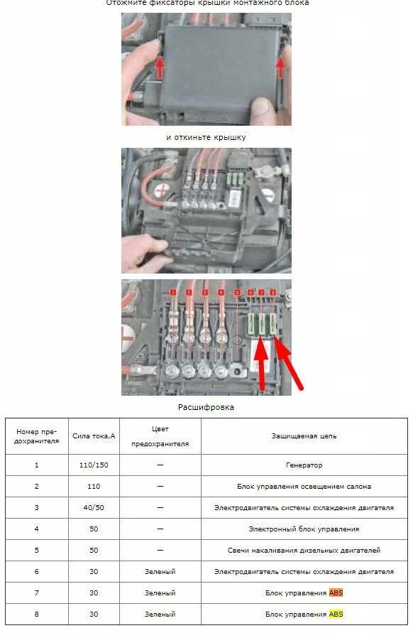 - Предохранители блока ABS. В салоне проверьте предохранитель под номером 9 (5А) и под капотом предохранители 7,8 (30А). Михаил С. указал их расположение.
