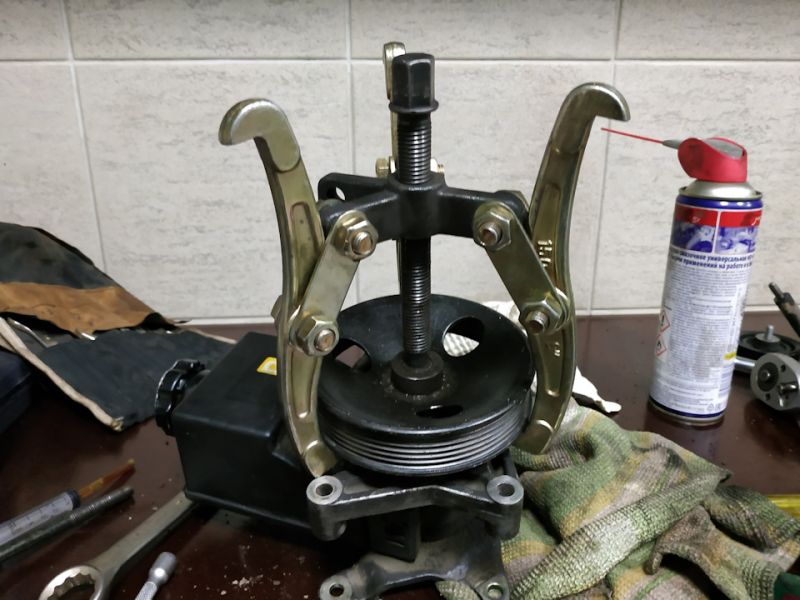 -возьмите трехлапый съемник и установите его на шкиву насоса, а упор сделайте на центральный пятак (на фото указано);