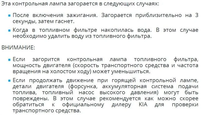 Загорается индикация воды в топливном фильтре Киа Соренто