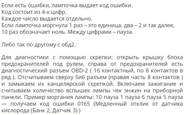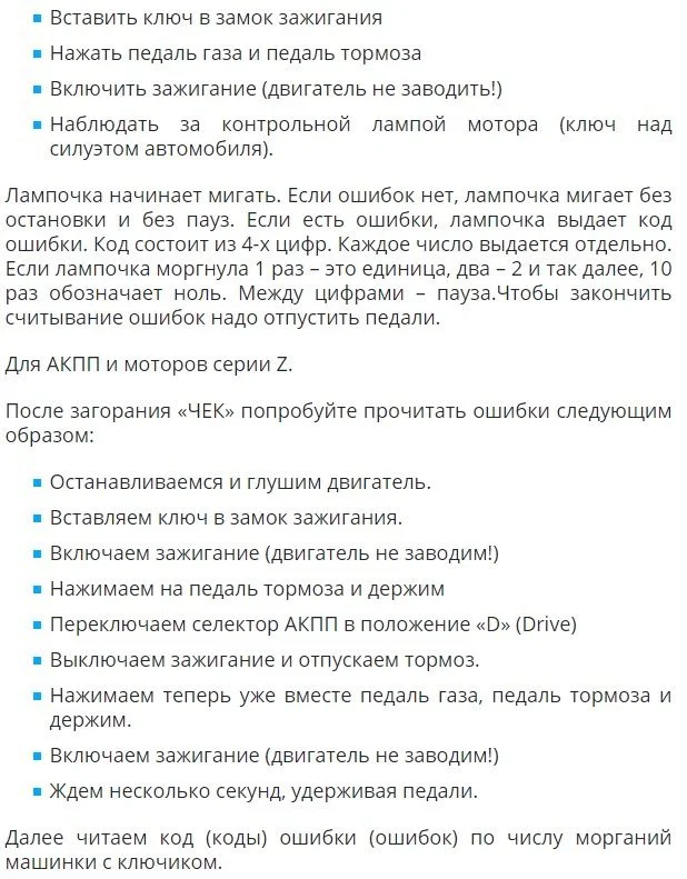 У вас обд2 есть? Под рулём? Либо так.Самодиагностика. Считываем коды ошибок двумя педалями. Для авто с механической КПП.