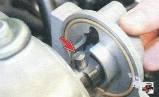 Снимите крышку головки блока цилиндров, сдвигая ее назад и развернув так, чтобы задающий штифт датчика фазы, запрессованный в распределительный вал, совпал с пазом в крышке.