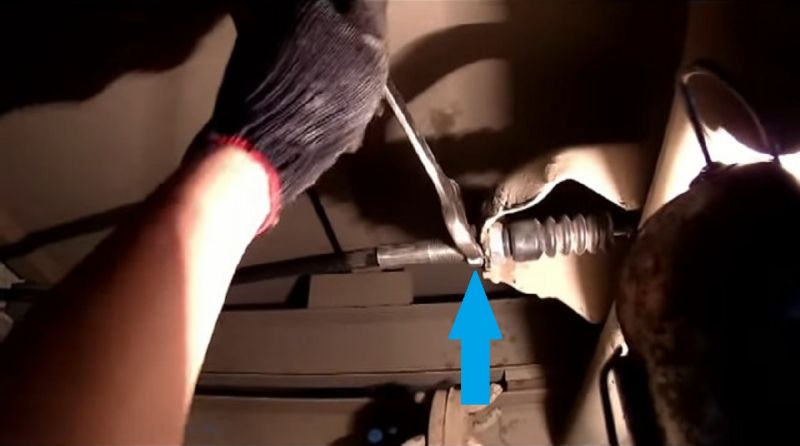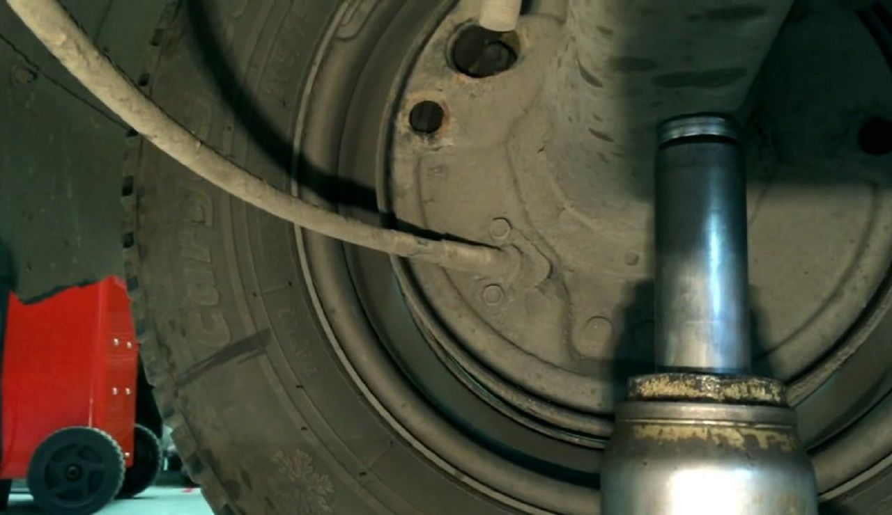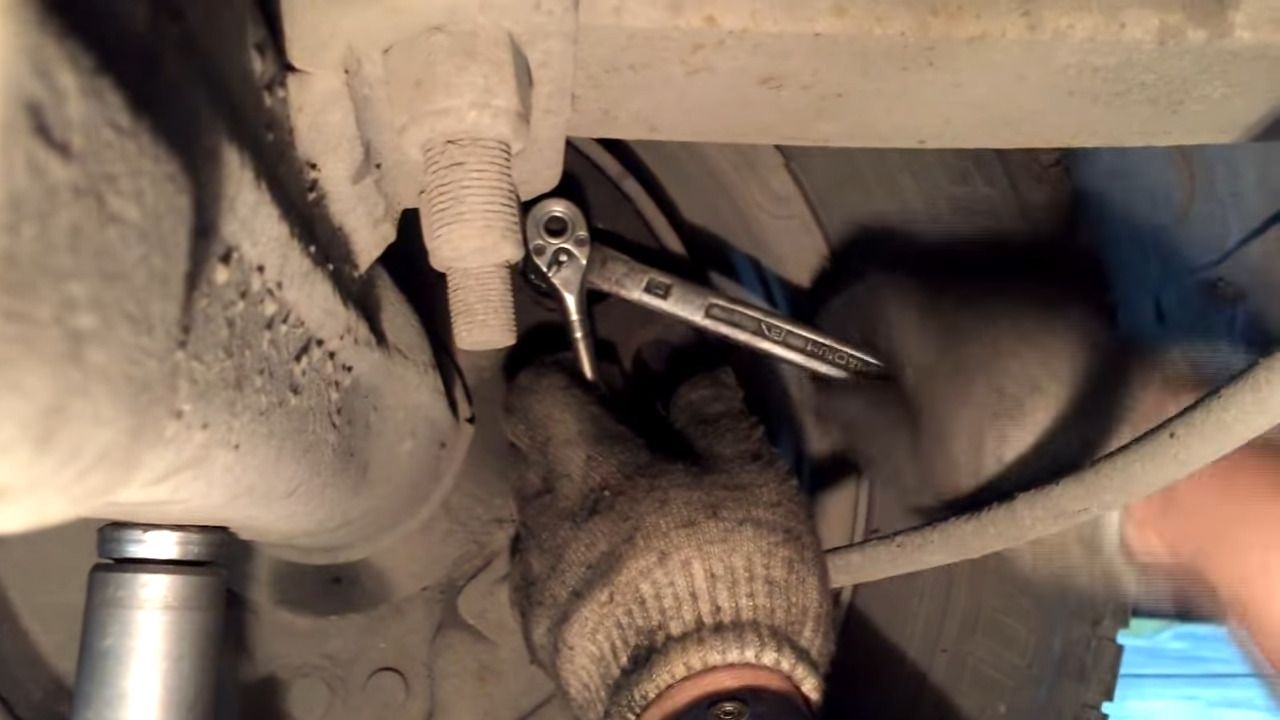 Установите автомобиль на яму или подъемник (либо придется подлазить под авто). Ослабьте гайки крепления, поддомкратьте ось.