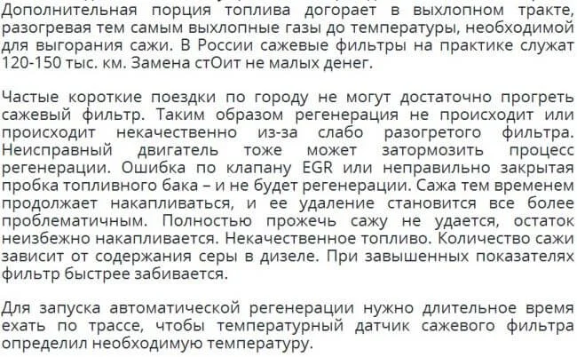 Сажевый фильтр в автомобиле с дизельным двигателем саморегенирирующийся, то есть для того, чтобы запустилась процедура регенерации надо, либо подать команду с компьютера, либо выехать за город и проехать примерно 10 километров со стабильной скоростью выше 60-ти км/час, главное, чтобы стабильная скорость была, при таких условиях сработает 100%, понять что запустился процесс регенерации можно по сизому дыму из выхлопной и его будет очень много. Вообще заграничными конструкторами задумано было что сажевый фильтр имеет ресурс ориентировочно 250 тыс. км. Выжигание всего плохого в нем делается не один раз, а происходит, когда автомобиль двигается при определенных условиях. И чем ближе пробег автомобиля в 250 т.км, тем меньше эффективность этого выжигания. Но так как в России топливо по качеству хуже чем в Европе, то и сажевый фильтр работает меньше положенного.