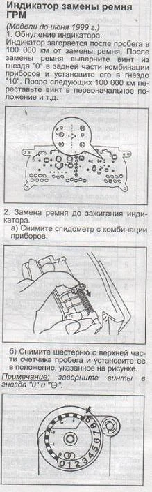 При замене ремня T-BELT просто перекручивается в другую позицию саморез и таким образом перемыкаются площадки, далее включается зажигание, отображается например 20 20 на одометре (200 тысяч сработка и вторая двадцатка, когда сработать в следующий раз), нажимаем ODO — вторая 20-ка меняется на 30-ку (что соответствует 300 тысячам для загорания индикатора T-BELT), выкручиваем болтик перемыкающий дорожки не выключая зажигания, потом выключаем, включаем снова — заводим и… лампочка гаснет, прямо на пленке эти надписи не дадут заблудиться.