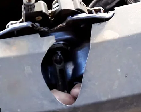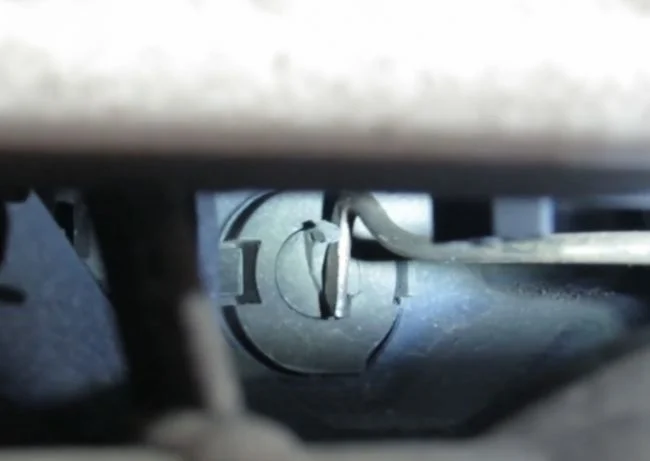 Если тяга слетела с личинки замка, то сняв защиту мотора снизу, можно добраться до тяги снизу вверх рукой. Можно проворачивать, а можно выдернуть тягу из замка и использовать способ с отвёрткой.
