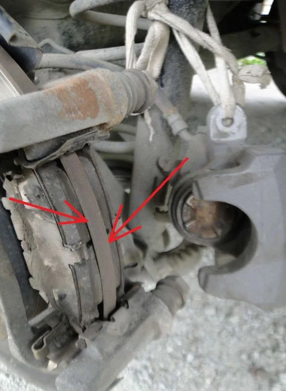 Отвёртку вводить в эти места, между диском и колодкой (в сам поршень нельзя упираться отвёрткой, он может помяться)