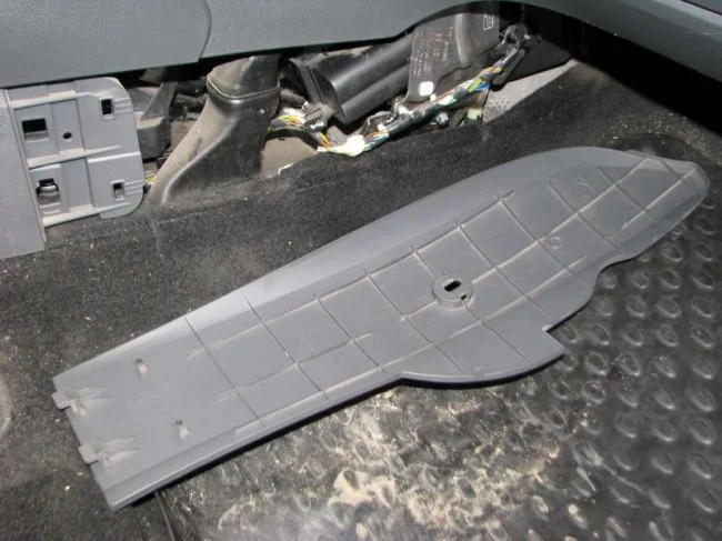 - Сначала снимаем пластиковую обшивку, прикрывающую доступ к дренажу. Она находится с левой стороны от ног переднего пассажира. Чтобы снять ее, понадобится звездочка Т25, или обычная плоская отвертка с подходящим размером.