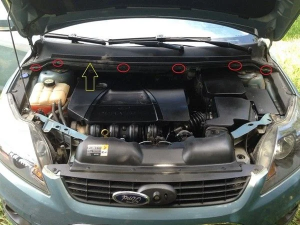 - перед началом работы нужно открыть капот, и снять крепления дефлектора лобового стекла (на фото отмечены красным), и потом вытащить воздухозаборник (отмечено желтым на фото).