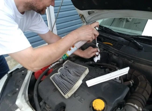 После задувания средства в систему нужно подождать приблизительно 30 мин., чтобы очиститель максимально вышел через дренажные отверстия. Далее нужно продуть систему. Для начала ставим новый фильтр салона, заводим мотор, включаем обороты вентилятора на Максимум, а температуру на Минимум, и открываем окна. В таком режиме авто должно поработать минут 10-15. Находится в салоне не желательно, так как из кондиционера будут выветриваться остатки очистителя.