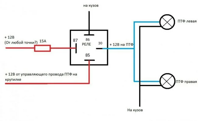 Да в общем всё элементарно. От габаритного предохранителя берём плюс для включателя. После включателя один провод идёт на индикаторную лампу, второй — на реле. Вторые контакты реле и лампы — на ближайшую массу. Силовой провод на реле можно взять непосредственно от аккумулятора, через предохранитель. Силовой провод от реле идёт на одну фару, от неё на вторую. Массу для фары можно прикрутить в любом удобном месте.