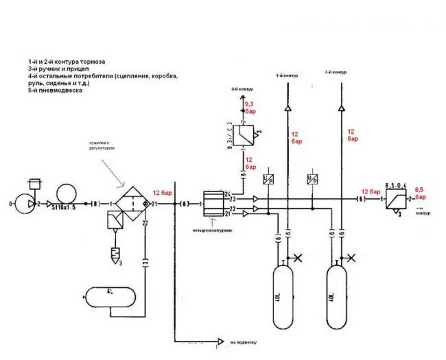 Нужно определить сначала общее давление воздуха на четырех контурник (или пяти контурник), может оно низкое, если низкое, то проблема может быть в компрессоре, в клапане на осушите (рано сбрасывает давление). Если в норме, то проверить давление в четвертом контуре, должно быть примерно 9,3 бар, если ниже, то проблема может быть в клапане четырех контурника.