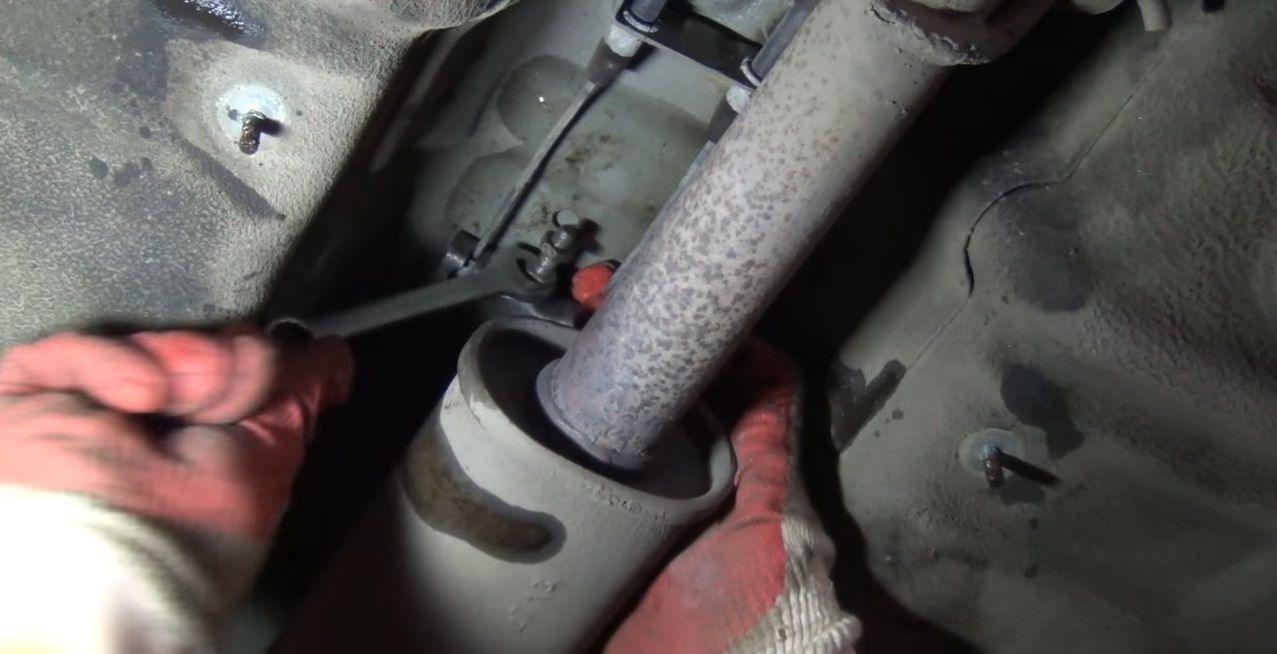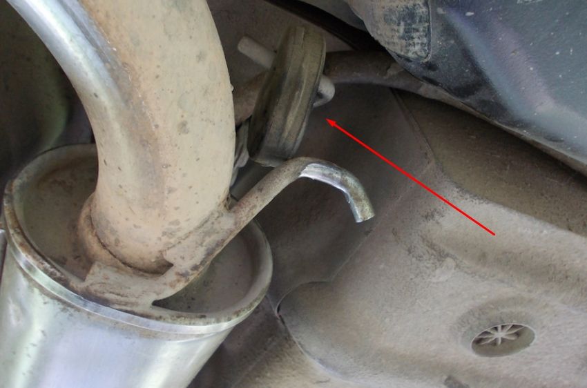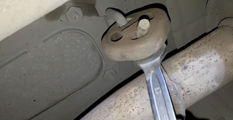 - Установите автомобиль яму и снимите резинку среднего глушителя. Удобно ее снять с помощью рожкового ключа.