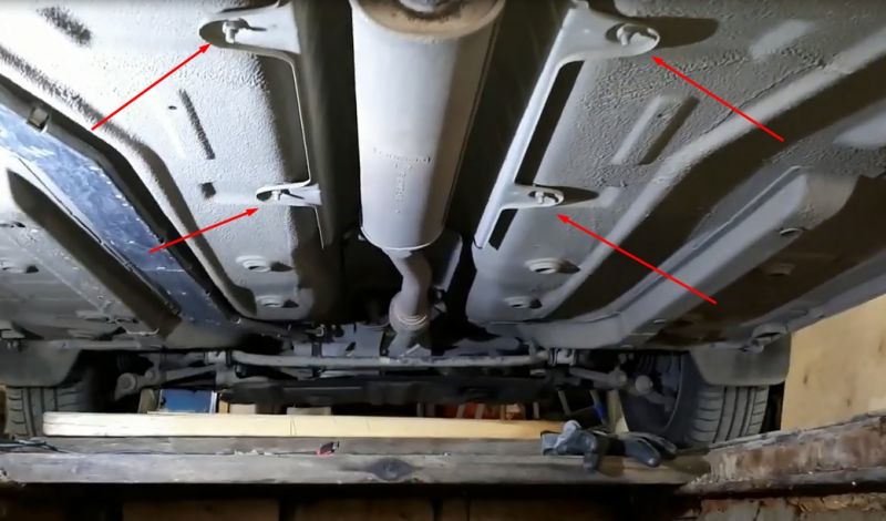 - Открутите четыре крепящих гайки и снимите тепловой экран среднего глушителя. Экран выводите к передней части автомобиля, там где стояла резинка глушителя. Гайки под головку на десять.
