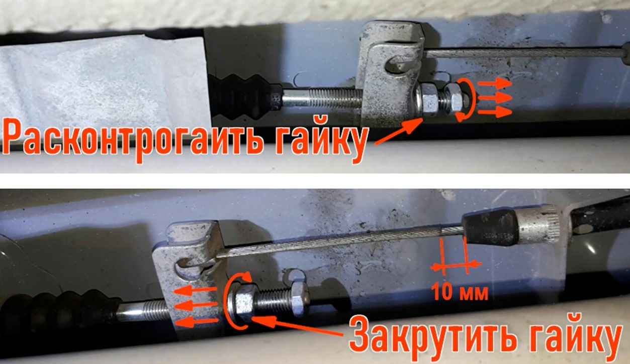 - Ослабьте контргайку ключом на “13” и далее закручивайте регулировочную гайку привода до момента пока ручник будет фиксировать автомобиль на второй или третий щелчок. Если у вас ручник схватывает на восьмом щелчке, то гайку нужно закрутить примерно на 10 мм. Лучше всего в процессе регулировки периодически проверять ход ручника.