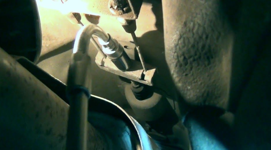 - Снимите резинку заднего глушителя. Это нужно для того, чтобы опустить выхлопную систему ниже и получить лучший доступ к механизму регулировки.