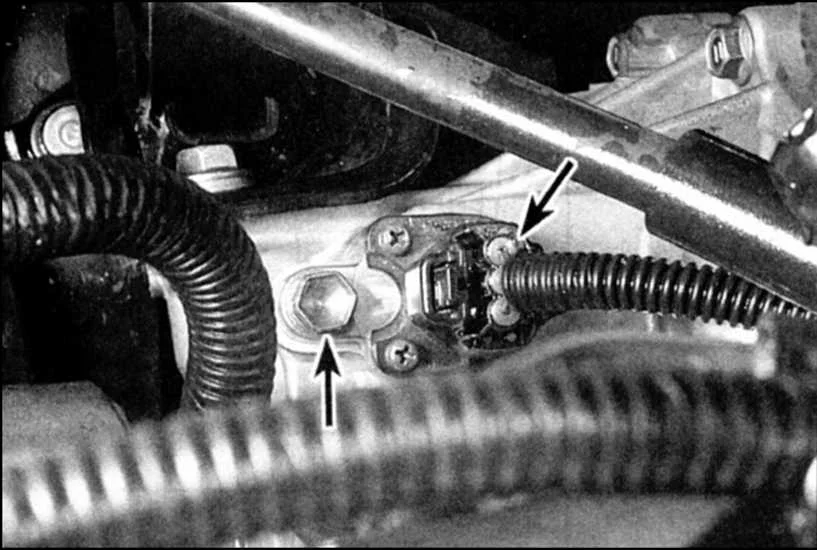 Отсоедините разъем подключения датчика скорости (показано на рис.), открутите болт (показан стрелкой на рис.) и вытащите датчик из коробки передач.