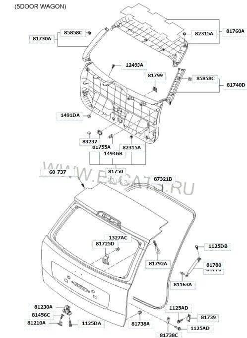 Насколько я понял, Вы хотите снять обшивку двери багажника. Для этого нужно открутить болты ее крепления и снять ее, она разделена на четыре части(смотрите приложенную схему), они держаться на клипсах. Нужно поддеть части обшивки пластиковой лопаткой.