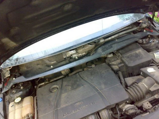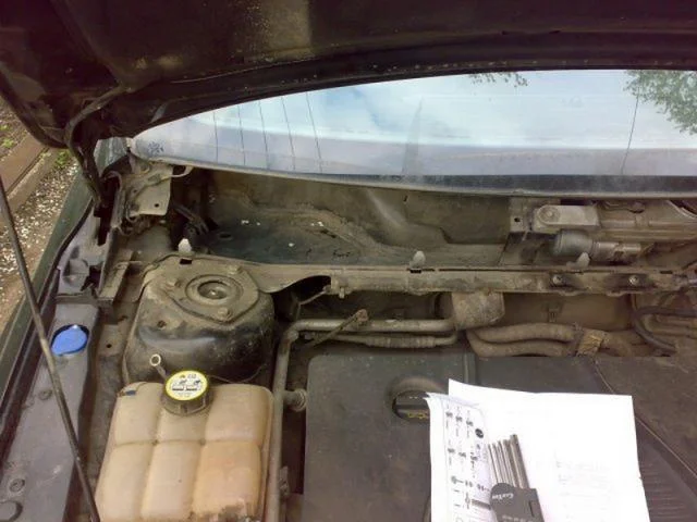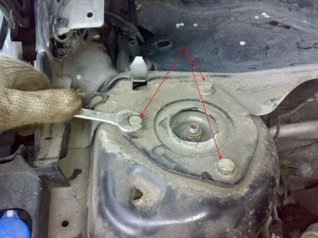 Что бы заменить опорный подшипник понадобится снять стойку аммортизатора в сборе, при этом совсем не обязательно разбирать всю подвеску. Достаточно отсоединить стойку стабилизатора, поворотный кулак и освободить верхнее крепление стойки. Работы начинаем со снятия минуса с аккумулятора. Пока разряжаются конденсаторы освобождаем доступ к верхнему креплению стойки. Для этого снимаем дворники.