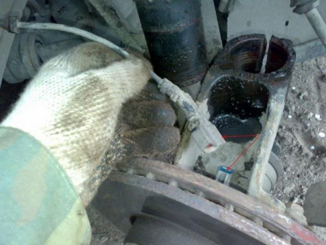 Сдёргиваем тормозной шланг с держателя на стойке. Затем место крепления в поворотном кулаке расклиниваем зубилом и вынимаем стойку из кулака.
