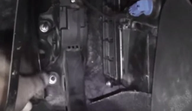 Педаль держится на трёх шпильках гайками. Третья находится сверху за педалью.
