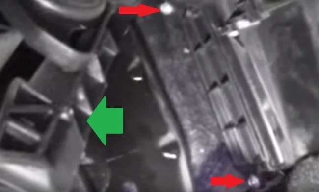 После снятия педали отводим её вверх влево и подвязываем(зелёным). Теперь надо открутить крепление крышки фильтра(красным, гайки на 7).