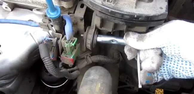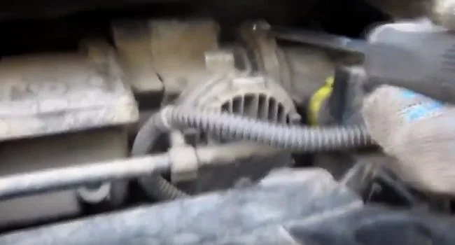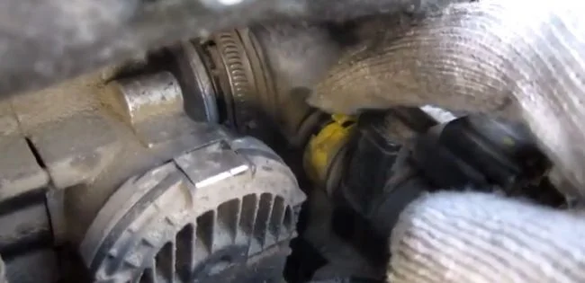 Для удобства снятия корпуса снимаем шланг рядом с корпусом. Там стоит жёлтый хомутик, для его ослабления усики хомута сжимаем навстречу друг другу.