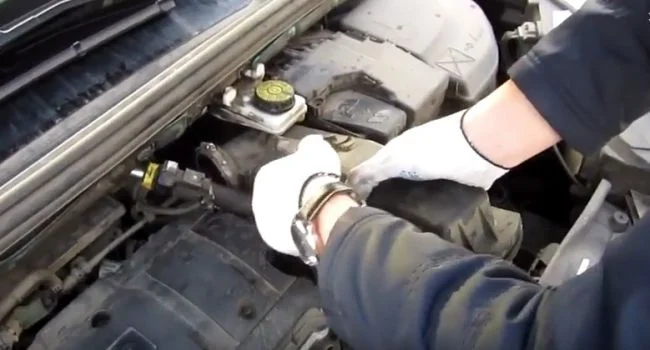 Ослабляем и сдвигаем хомут удерживающий патрубок от фильтра к мотору.