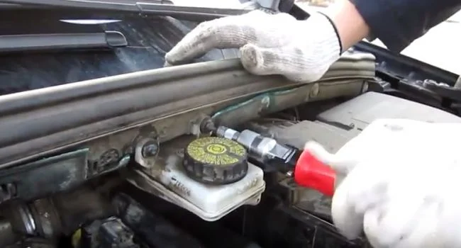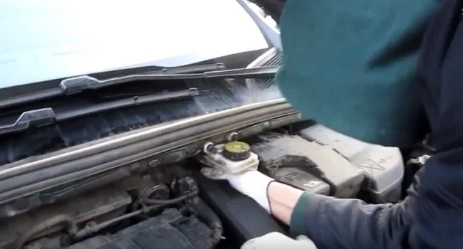 Снимаем с крепежа бачок тормозной жидкости и оставляем его висеть, или отодвигаем в сторону если позволяет длина шланга.