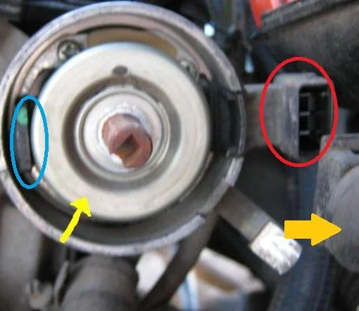 На изображении синим — сам датчик, жёлтым — ротор, красным — разъём датчика, тёмно-жёлтым — штекер датчика и собственно та резинка которую надо стянуть для проведения замеров.