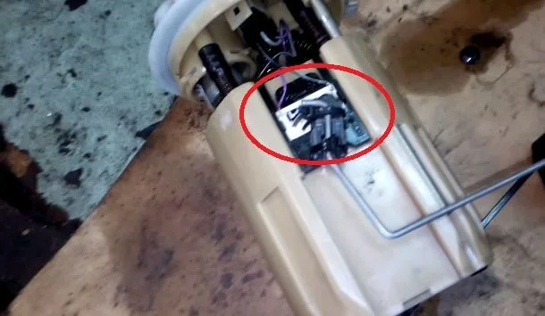 Сам датчик располагается в погружном топливном модуле, который размещен в бензобаке. Найти его просто, так как к нему крепится поплавок (размещение показано ниже на фото).