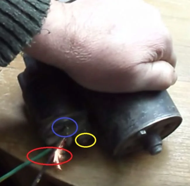 Возможен вариант когда подгорают контакты втягивающего реле. Оно щелкает, но стартер не крутит. В этом случае стартер можно проверить без нагрузки, в холостом режиме. При подключении плюсового провода с аккумулятора на контакт обведённый жёлтым, стартер будет вращаться без соединения с маховиком(зажужжит).