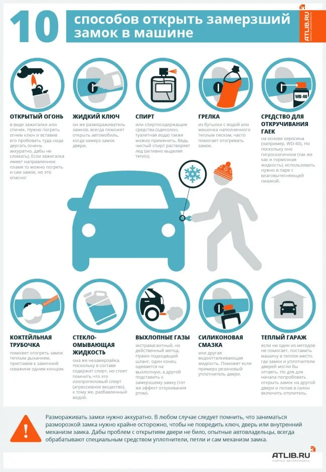 Зажигалкой аккуратнее, можно и пластик ключа расплавить. Есть специальный размораживатель замков, можно его налить в личинку, так же некоторые автовладельцы заливают омывающую жидкость, антифриз. Так же есть тут