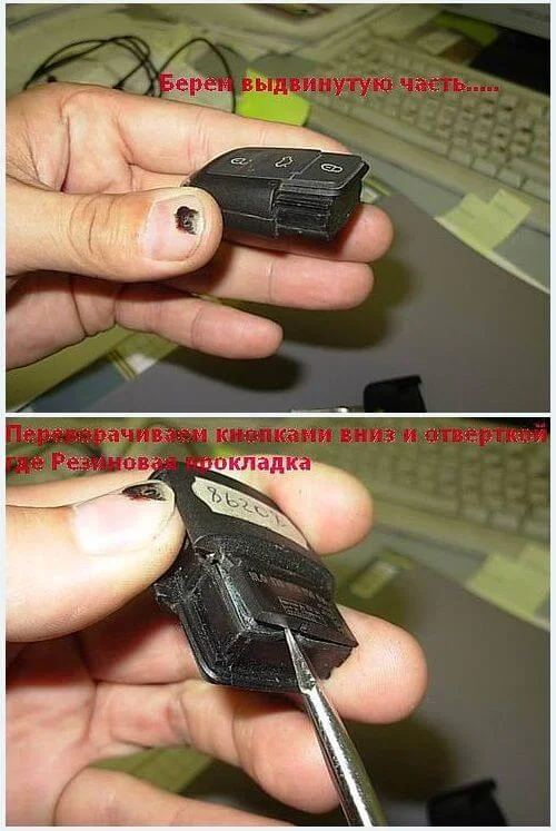 Перевернуть эту часть ключа кнопками вниз и пройтись отверткой по шву.