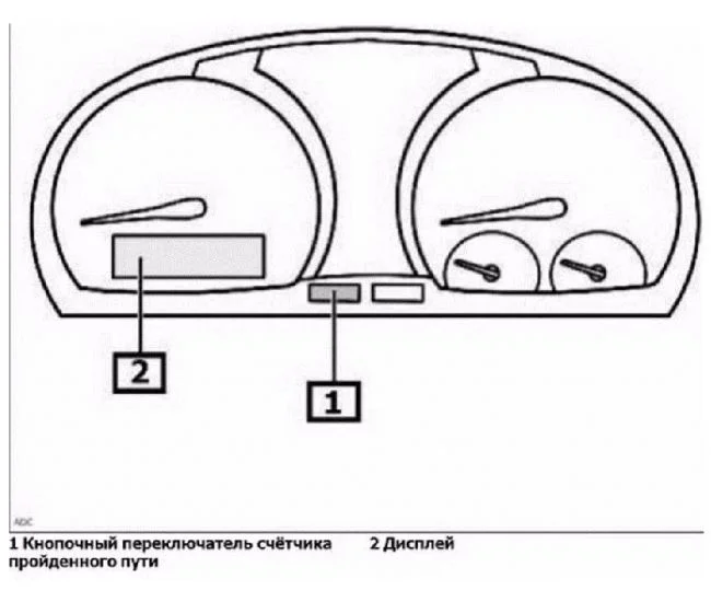 - Нажать и удерживать кнопочный переключатель счетчика пройденного пути. (№1 на прилагаемом рисунке).