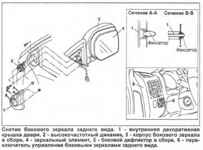 Нужно сдернуть (держится на клипсах) пластиковую треугольную накладку обшивки двери, далее частично сдернуть обшивку двери в районе зеркала, отключить разъем, далее открутить гайки/болты крепления зеркала и снять его.